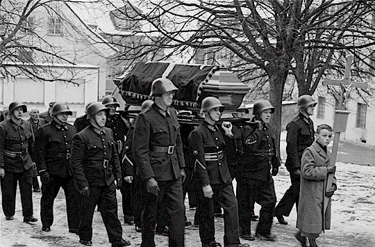 Beerdigung des Feuerwehrkommandanten Albert Huber-Planzer in Altdorf, 1955 (StAUR Slg Bilddokumente FAA 272.19-BI-57718).